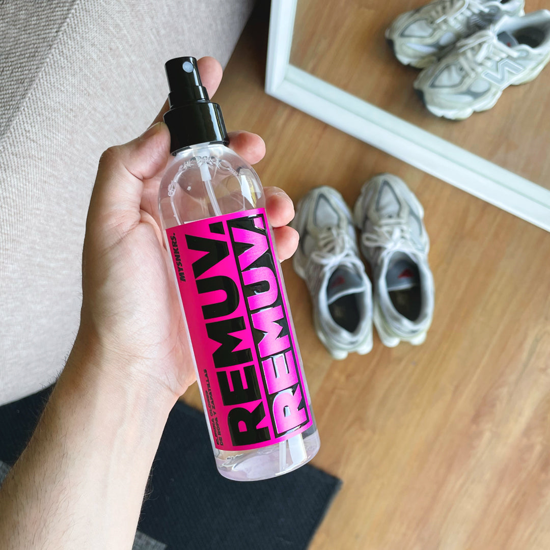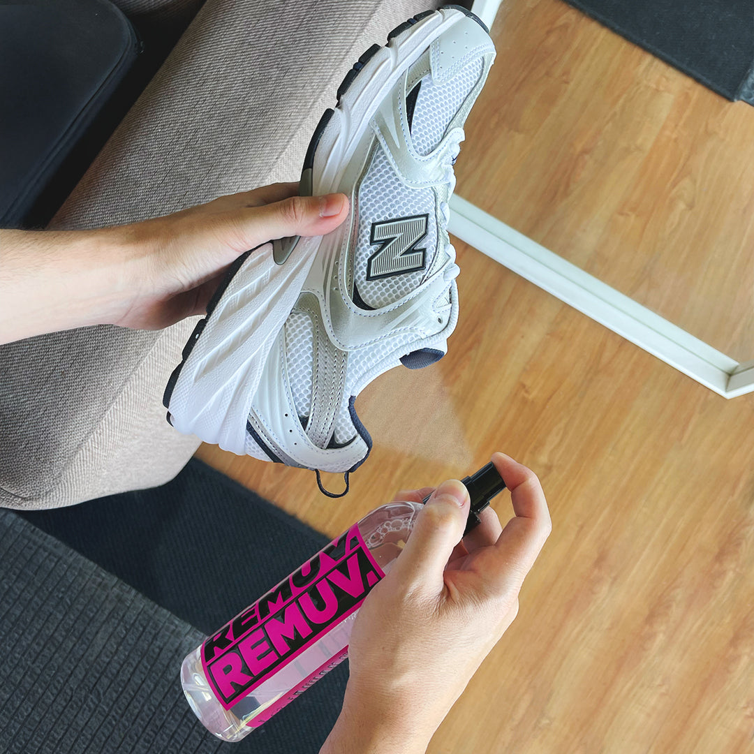 REMUV Quita Olores utiliza una fórmula biotecnológica con enzimas activas y bacterias beneficiosas que descomponen la materia orgánica responsable del olor a sudor de tus Zapatillas, Ropa y Bolsos.